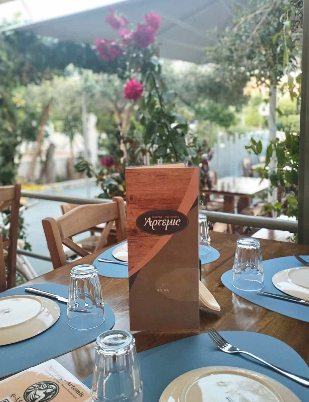 Η εξωτερική αυλή του «Άρτεμις» είναι ένας ήρεμος και όμορφος χώρος, γεμάτος φυσικό φως, όπου μπορείτε να καθίσετε και να απολαύσετε τα γεύματά σας κάτω από τον ανοιχτό ουρανό ή με δροσιά κάτω τη σκιερή τέντα μας.